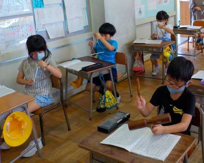 2拍子と3拍子と4拍子のいろいろなリズムに挑戦しました。楽器によって同じリズムでも聞こえ方に違いがあることに驚きながら、リズム遊びを楽しみました。