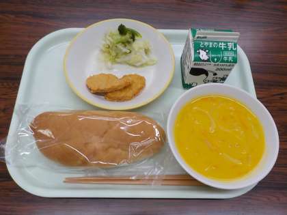 今日の献立は、コッペパン、牛乳、チキンナゲット、フレンチサラダ、かぼちゃポタージュでした。