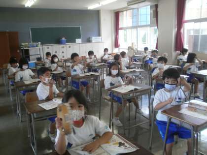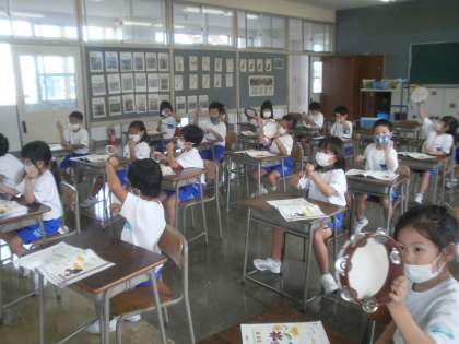 トライアングル、すず、タンブリンを使いました。一つの楽器でも、長く響かせたり、短く切ったりして、いろいろな音が出せることが分かりました。