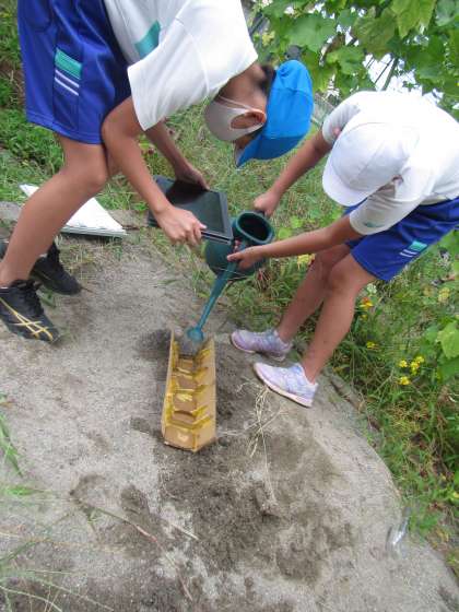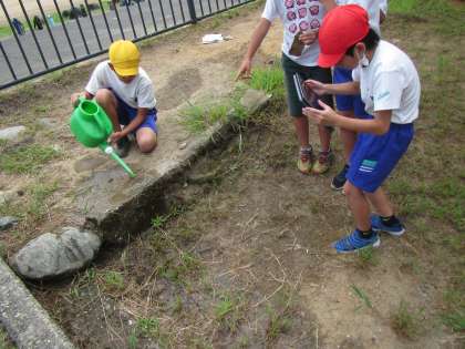常願寺川の水害対策等を、実際に実験を通して確かめる「常願寺川研究所」が始まりました。これまで、校外学習、映像、資料、授業等で知ったことで気になることが出てきた子供たち。実験計画を立てた子供から実験を始め、その様子をクロムブックで記録していきます。