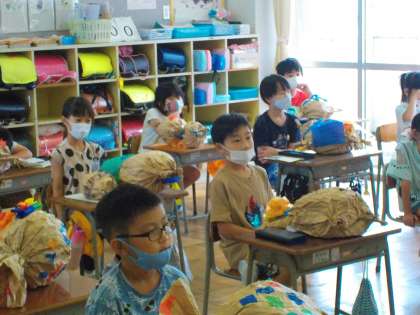 今日、図画工作科で制作していた作品が仕上がったので、友達に紹介しました。1枚の袋から生まれた作品です。袋に新聞紙を入れ、て自分の思い描いたものに変身させました。大きな口を開けた魚、かまきり、かわいいねこ、虹色のクワガタ・・・「みんな違ってみんないい」作品になりました。