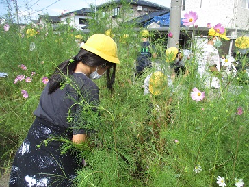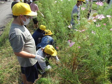 コスモスロードの除草をしました。新型コロナウイルス感染症対策のため、縦割り班での活動はできませんが、5年生として一生懸命取り組むことができました。さっぱりした花壇を見て、子供たちは満足の様子でした。