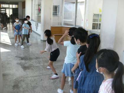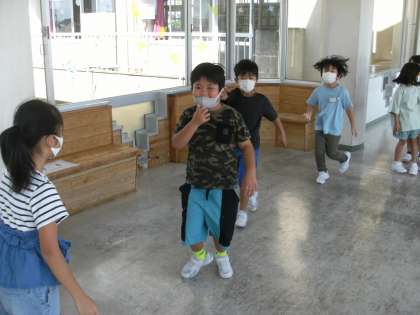 じゃんけんゲームをして楽しく休み時間を過ごしています。じゃんけんをして負けると「カモーン」と言って、ぐるっと一周回っています。同じチームの友達が勝つように、「がんばれ」と応援する優しい子供たちでした。