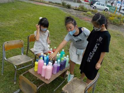 「きれいな色が集まるといいね。もっとつくろう」「みんなで丈夫な屋根にするよ」と、各グループで声をかけ合いながら、夢中になって活動しています。今日は、台風対策も考えていました。