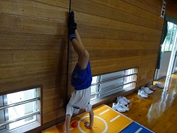 マット運動の様子です。開脚前転や開脚後転、倒立など、様々な技にチャレンジしています。