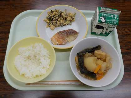 今日の献立は、ごはん、牛乳、赤魚の塩焼き、卵ときくらげの炒め物、炊き合わせでした。