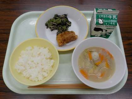 今日の献立は、ごはん、牛乳、豚肉の香り揚げ、よごし、つみれ汁でした。