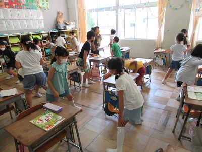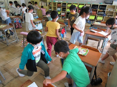 音楽科の授業では、体を使ってじゃんけんをする遊びをしました。体いっぱい使ってじゃんけんをしたので、子供たちは汗をかいていました。