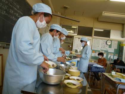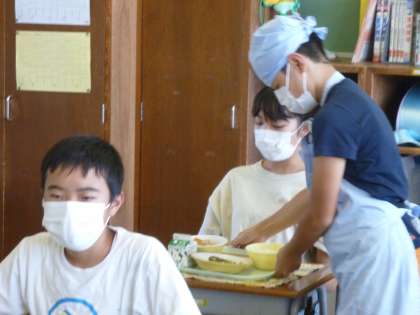 今日の給食の配膳の一コマです。 手早く準備を進めていました。