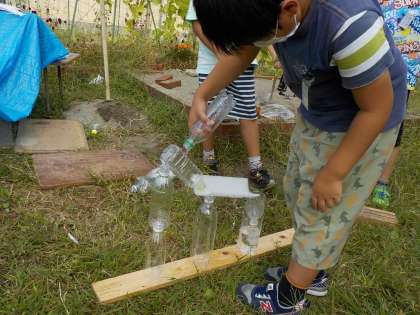 「雨水のウォータースライダーがうまくいくか実験だ」