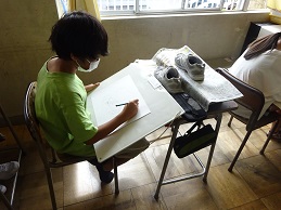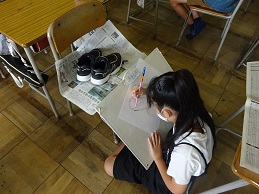 図画工作科では、自分の靴のデッサンをしています。細かい縫い目や少し汚れているところまで、じっくり自分の靴を見て、描いています。完成が楽しみです。