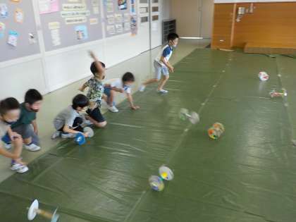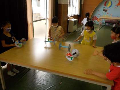 図画工作科で制作した「かみざら コロコロ」で遊びました。回転して絵が変わっていく様子を楽しんだり、みんなでどれだけ遠くに行くのか競争したりしました。個性的で工夫した「コロコロ」がたくさん転がっていました。