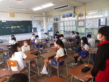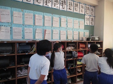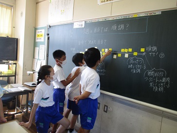 今日の学び合いタイムは「今週の目当ての取組はどう?順調?」というテーマでした。「気持ちのよいあいさつを毎日続けているよ」「あまり背すじをピンとのばしていないな」など、教室後方に掲示してある「今週の目当て」に目をやっていました。自己評価をした後、「いや、○○さんは社会科の時間は、目当ての調べ学習を最後まで集中して調べていく」ができていたよ!」と仲間に励まされながら、自分の目当てを振り返ることができました。