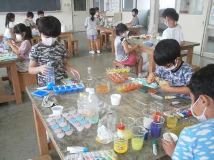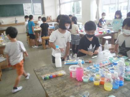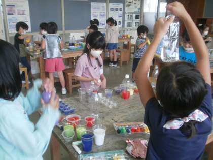 水の入ったペットボトルのふたの裏に絵の具を塗り、ふたをして振りました。できあがった色水をグループで並べたり、混ぜてできた色を見せ合ったりして、楽しく活動しました。