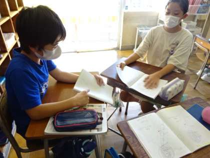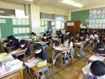 3枚目は、理科の授業の様子です。台風16号に関して調べたことを班で伝え合い、分かったことをまとめています。