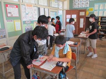 2枚目は、外国語科の授業の様子です。身近な人を友達同士で伝え合う活動をしました。