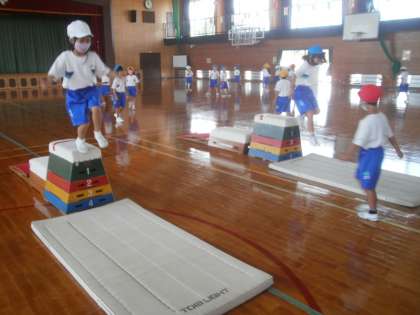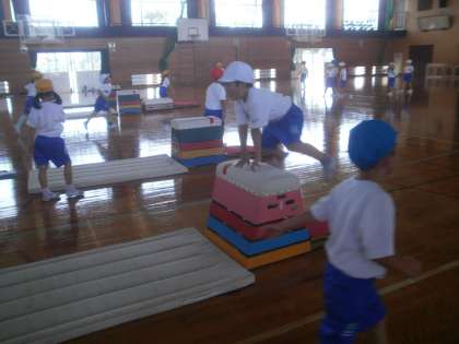 跳び箱遊びの3時間目です。準備や片付けがすばやくなり、ロイター板を使って思い切り踏み切ることにも慣れてきました。