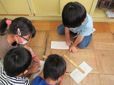 算数科では、長方形の特徴を調べました。グループでたてと横の辺の長さを測り、向かい合う辺の長さは同じなることに気付きました。1ミリメートルの違いもないように、一生懸命ものさしの目盛りを読み取っています。