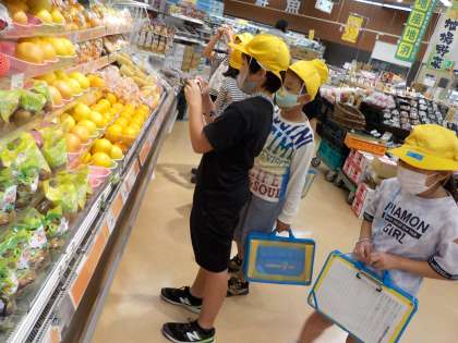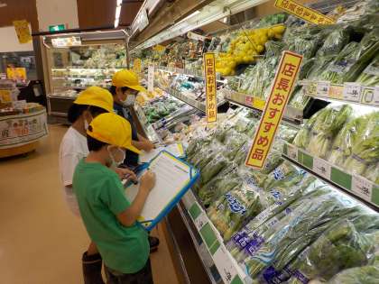 お店にたくさんのお客さんに来てもらうために、スーパーマーケットで働く方がどのような工夫をしているのか調べました。気になることを質問したり、見付けたことをカードに記録したりするなど、真剣に取り組んでいました。