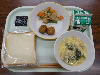 今日の献立は、食パン、牛乳、ミートボールの照焼き、れんこんソテー、卵コーンスープ、チョコレートクリームでした。