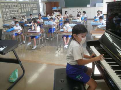 「ピアノの演奏を聴いて、楽しい気持ちになってほしい」と、音楽係が計画しました。ピアノの練習や司会の練習をがんばっていました。