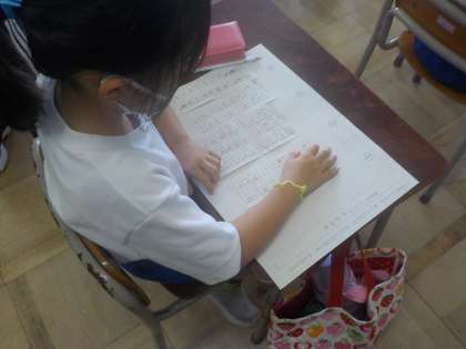 国語科の学習では、家族に知らせたいお気に入りの物を決めて、それを紹介する文章を書いています。今日は、短冊に書いた文章を、どんな順番でお知らせしたらいいか考えました。家族に分かりやすく伝えるためにはどうしたらよいか、よく考えて短冊を並べ替えていました。