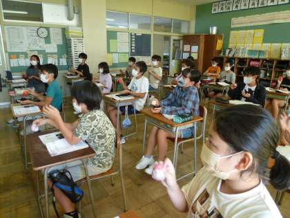 音楽科の時間に、「ハンガリー舞曲」を鑑賞しました。作曲者の工夫を見付ける学習でした。お手玉を音楽に合わせて動かすことで、速度や強弱、弾む音となめらかな音の感じなどを感じ取っていました。