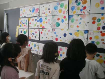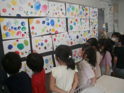 水彩絵の具を使って仕上げた作品を、黒板に貼りました。黒板いっぱいにいろいろな形や色のシャボン玉が飛んで、とてもきれいでした。