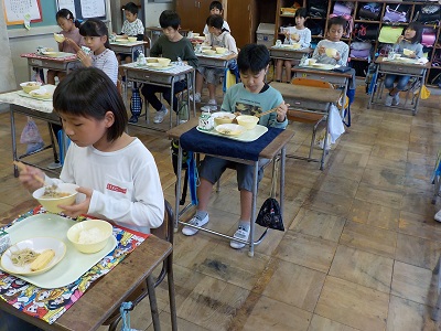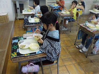 姿勢良く食べようとがんばっています。背筋は伸びてきました。ピンとのびたまま食べ続けましょう。残す量も減るといいですね。目指せ残飯ゼロ!