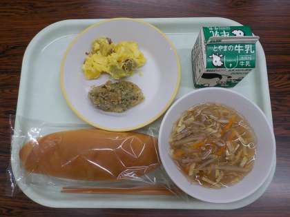 今日の献立は、米粉コッペパン、牛乳、鱈の香草焼き、チーズおさつ、はるさめスープでした。