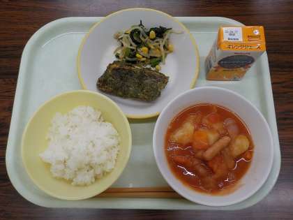 今日の献立は、ごはん、魚のフリッター、コーン和え、豆とソーセージのトマト煮、オレンジジュースでした。
