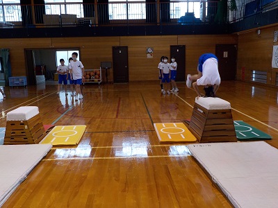 体育科「跳び箱運動」では、台上前転に挑戦しています。手や頭をつける位置を工夫したり、着地をきれいにするために姿勢に気を付けたりして、練習を続けています。
