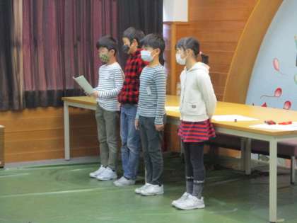 共体験学習に向けて、式の確認をしました。代表の挨拶を自分で考えたり、覚えて堂々と言おうとしたりするなど、前向きな姿が見られました。