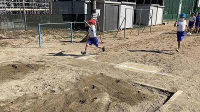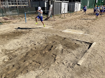体育科では、走り幅跳に取り組んでいます。助走から跳ぶときのリズムが、とても難しいようです。利き足で踏み切れるように、足を合わせています。次は、記録をとってみます。