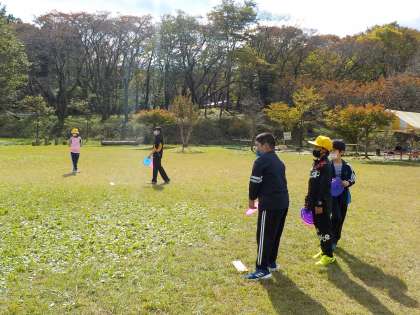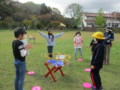 的となるかごに向かってフリスビーを投げ入れる活動をしました。班の全員で楽しめるよう工夫しました。