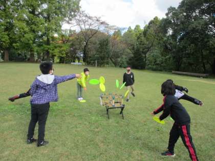 的となるかごに向かってフリスビーを投げ入れる活動をしました。班の全員で楽しめるよう工夫しました。