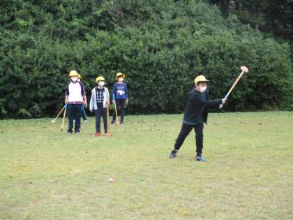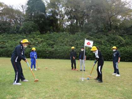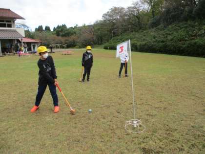 班に分かれて、ゴルフをしました。ポイントにできるだけ少ない回数で入れるように、力の加減を考えてスイングしました。