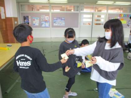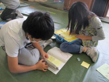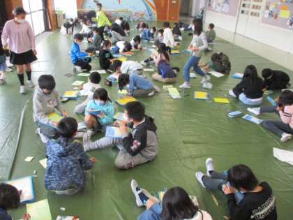 共体験学習の振り返りをしました。班の友達のよいところを見付けて、言葉にして伝え合いました。