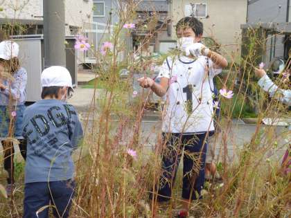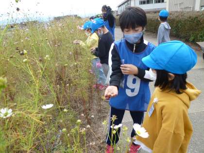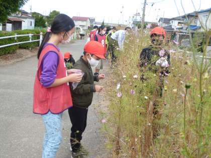 縦割り班でコスモスの種取りをしました。やさしく下学年に声をかけ、生い茂るコスモスの中に入って作業する姿が見られました。一輪車を押し、ほうきではき、カルバートがいつものようにきれいになるまで、責任をもって活動しました。