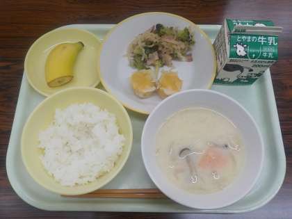 今日の献立は、ごはん、牛乳、にんじんシューマイ、切り干し大根のペペロンチーノ、豆乳みそスープ、バナナです。