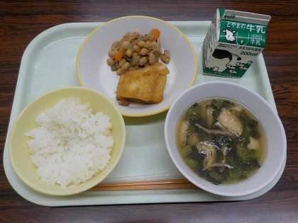 今日の献立は、ごはん、牛乳、揚げ魚のレモン味、五目煮豆、うすくず汁でした。
