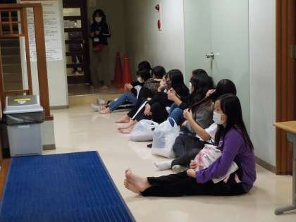 浴室の更衣室が密になるため、このように入口で待っています。入浴後「温泉は、気持ちよかったかな?」と声をかけると、「はい!」と満面の笑みの子供ばかり。でも、「入浴後の写真はとらないで」「恥ずかしい!!」男子にも女子にも言われました。もうすっかり大人の感覚です。