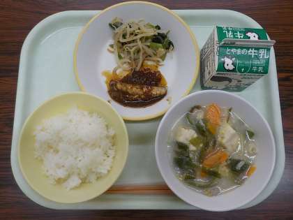 今日の献立は、ごはん、牛乳、塩こうじ鍋、いわしの土佐煮、おひたしでした。