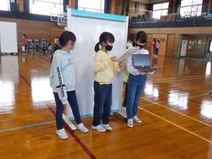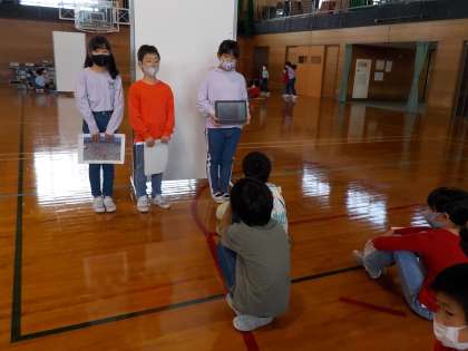 聞いている人を意識して、「ゆっくり・はっきり」と話す練習をしています。友達同士でアドバイスし合う姿もあります。