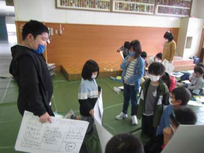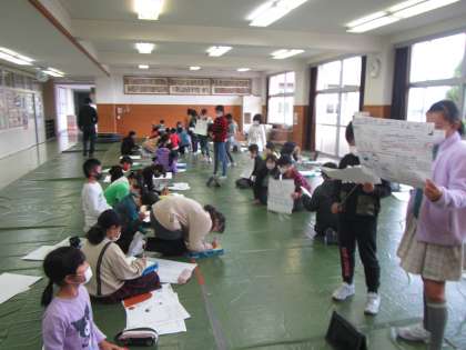 グループごとに互いのクラスの発表を初めて聞きました。保護者の皆さんがどう感じるか考えて、アドバイスやよいところをふせんに書いて渡しました。合計300枚以上のふせんが子供たちの元へ渡りました。よいところを認めてもらえてうれしそうな子供、改善点に気付き気合を入れる子供の姿が見られました。