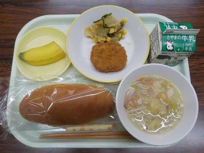 今日の献立は、コッペパン、牛乳、豆とかぼちゃのコロッケ、大根サラダ、キャベツスープ、棒チーズ、バナナでした。