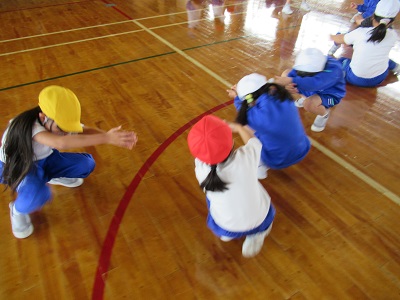 体を慣らすために、体を目一杯使ってじゃんけんゲームをして大盛り上がりでした。その後、猛獣狩りやまねっこゲームなどをして、一人一人がイメージする動物になりきる活動をしました。写真は、「オオクワガタ」になりきっています。