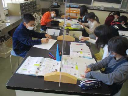 空気の体積と温度の関係について考えています。班で実験方法や結果を予想してから実験しました。