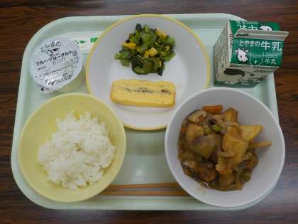 今日の献立は、ごはん、牛乳、しいらの黒酢あんかけ、えごま入り卵やき、小松菜サラダ、ラフランスヨーグルトでした。