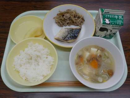 今日の献立は、ごはん、牛乳、鯖の塩焼き、茎わかめのきんぴら、なめこのみそ汁、りんごです。